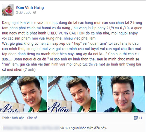 Chưa dừng lại ở đó, Đàm Vĩnh Hưng còn tâm sự nhiều hơn: "Bữa giờ bù đầu bù cổ vào các chương trình, album mới, lo dựng bài The Voice mới, vào phòng thu với Xuân Nghi và Ngọc Luân để kiểm tra phần thu âm của 2 bạn này đến tận 2-3 giờ sáng. Đúng thật là không còn khoảnh khắc nào cho riêng mình ngoài việc ngủ khoảng 5-6 tiếng...".