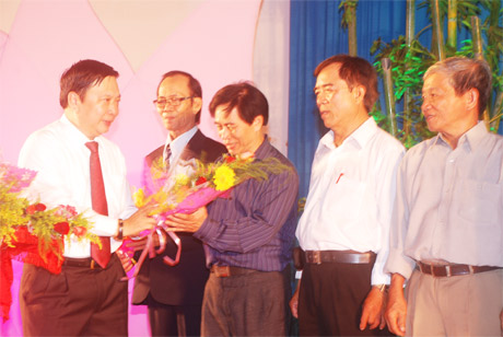 Bí thư Tỉnh ủy - Tiến sĩ Trần Thế Ngọc tặng hoa các nhà thơ quê Gò Công và có tác phẩm về Gò Công