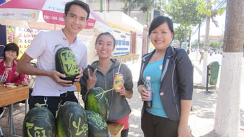 Bạn Ngọc Huyền (CĐ GDTH 11A) cũng bộc bạch thêm: "Tết sắp đến, mọi người luôn muốn có cặp dưa hấu thật đẹp để chưng ngày tết, chúng em sẽ đáp ứng nhu cầu của khách hàng. Chúng em nhận khắc chữ dưa hấu, có rất nhiều kiểu chữ: chữ Thọ, chữ Phước, chữ Lộc, đặc biệt có kiểu chữ 3 trong 1 rất đẹp. Đảm bảo khách hàng sẽ có 1 cặp dưa hấu vừa đẹp vừa lạ để chưng ngày Tết!".