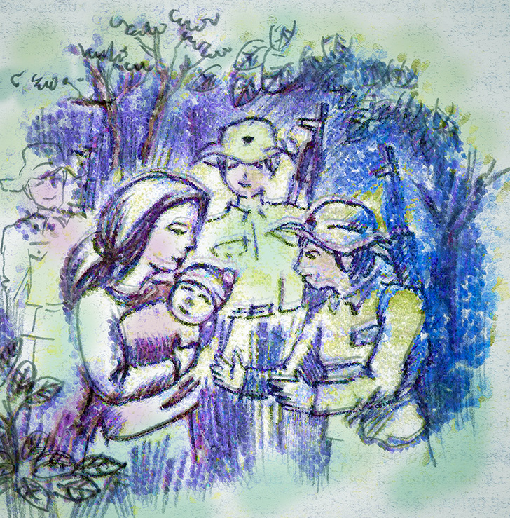 Chị sinh con trong địa hình. Một đứa con trai bụ bẫm. Vậy là bé Thắng ra đời. Cả đơn vị vui như ngày hội, xem đây là một sự kiện lớn. Ai có cái gì cũng giành cho bé Thắng. Mới đầy tháng, một cuộc càn lớn của quân Sài Gòn vào địa hình của đơn vị chị. Bế con xuống hầm đúng lúc một quả pháo nổ gần miệng hầm, đất vùi cả hai mẹ con. Như một sự che chở đầy bản năng của người mẹ, chị chống tay bảo vệ con, tay khác đẩy đất lên. Khi các chị trong đơn vị chạy tới thì bé Thắng đã cất được tiếng khóc. Xong trận càn, chị ôm con, vừa ngập tràn hạnh phúc vừa đau đớn.