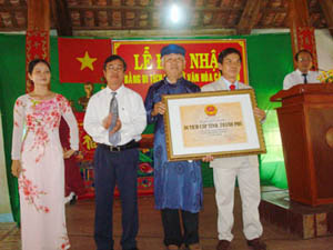 | Ông Nguyễn Tấn Phong, Phó Giám đốc Sở Văn hóa - Thể thao và Du lịch tỉnh trao bằng di tích lịch sử văn hóa. |