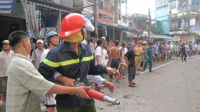 Đông đảo người dân đã cố gắng dùng bình chữa cháy tại chỗ và lấy nước từ sông Bảo Định gần đó chữa cháy nhưng không thành.