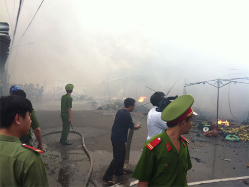 Trong vòng chưa đầy 15 phút, toàn bộ dãy vựa gần 100 căn đã bị bắt lửa và bùng cháy dữ dội. Khi lực lượng PCCC chuyên nghiệp của tỉnh có mặt, lửa đã thiêu rụi gần như hoàn toàn. Lực lượng chữa cháy chỉ còn tập trung công việc chính là ngăn chặn không để lửa lây lan sang nhà dân.